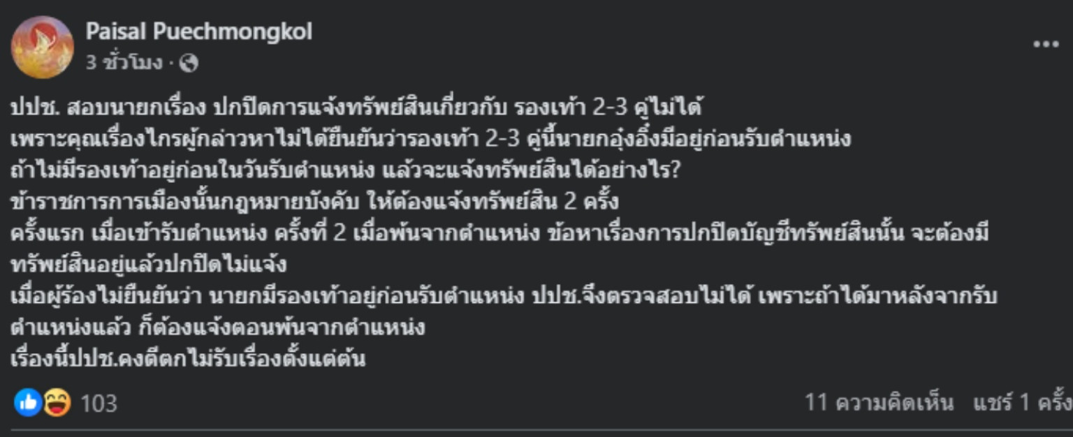 เมื่อผู้ร้องไม่ยืนยันว่า นายกมีรองเท้าอยู่ก่อนรับตำแหน่ง ปปช.จึงตรวจสอบไม่ได้ เพราะถ้าได้มาหลังจากรับตำแหน่งแล้ว ก็ต้องแจ้งตอนพ้นจากตำแหน่ง