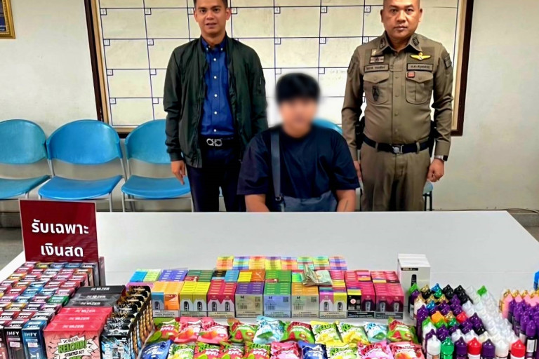 วันที่ 26กุมภาพันธ์ 2568 พ.ต.อ.พิเชษฐ์พงศ์ แจ้งค้ายคม ผกก.สภ.เมืองสมุทรสาคร ได้สั่งการให้ พ.ต.ท.สุขุม เพาะไธสง รอง ผกก.ป., พ.ต.ท.โสภาส ถนนทิพย์ สวป.พร้อมกำลังเจ้าหน้าที่ตำรวจ สายตรวจ ออกกวาดล้างจับกุมร้านจำหน่ายบุหรี่ไฟฟ้าตามนโยบายของพล.ต.ต.ธีระเดช อธิภัคกุล ผบก.ภ.จว.สมุทรสาคร พบร้านขายบุหรีไฟฟ้า บริเวณชั้นล่างแมนชั่น 9/19 A1ม.3ตำบลบางน้ำจืด อำเภอเมืองจังหวัดสมุทรสาคร เปิดร้านขายแบบโจ่งแจ้ง ชนิดไม่เกรงกลัวกฎหมาย มีบุหรีไฟฟ้าพร้อมน้ำยาหัวเชื้อทุกกลิ่นวางอยู่จำนวนมากในตู้โชว์กระจกขนาดใหญ่ พร้อมรับประกันในตัวสินค้าหลังการขายหากไม่พอใจ ไม่ตรงปก สามารถนำมาปลี่ยนมาเคลมอันใหม่ได้เจ้าหน้าที่ตำรวจจึงเข้าทำการจับกุม ค้นภายในร้านยังพบบุหรี่ไฟฟ้าและหัวเชื้ออีกจำนวนมากโดยมีนางสาวปุณยาพร อายุ 26 ปี รับเป็นเจ้าของร้าน