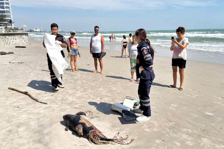 เศร้า! พบโลมาหัวบาตรคาดน็อกน้ำจากมรสุม ตายเกยตื้นทะเลหัวหิน