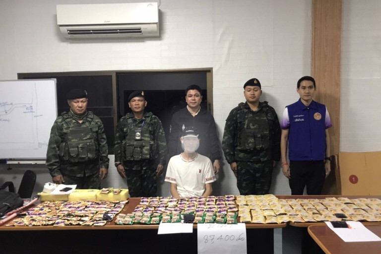 โดยครั้งแรกเมื่อวันที่ 28 ก.พ. 2568 ได้สั่งการให้นายธีระศักดิ์ พุทธรักษา ปลัดอำเภอกลุ่มงานความมั่นคงนำสมาชิกอาสารักษาดินแดน (อส.) อ.แม่สาย ที่ 5 และชุดปฏิบัติการพิเศษฝ่ายปกครองร่วมกับตำรวจ สภ.แม่สาย และทหาร ร้อย ม.3 บก.ผาทมิฬ ฉก.ทัพเจ้าตาก กองกำลังผาเมือง ร่วมกันจับกุมนายอรุษ ที่บ้านพื้นที่ ต.โป่งผา อ.แม่สาย จ.เชียงราย หลังจากสืบทราบว่ามีการลักลอบส่งยาเสพติดจากชายแดน อ.แม่สาย ไปยังภาคใต้ ผลการตรวจค้นพบของกลางเป็นถุงบรรจุกาแฟชงจำนวน 203 ถุง ถุงพลาสติกใส 3 ก้อน ภายในบรรจุยาบ้าอำพรางเอาไว้รวมจำนวน 87,400 เม็ด และเก็บเอาไว้ในกระเป๋าเดินทางสีดำอีกชั้นหนึ่ง