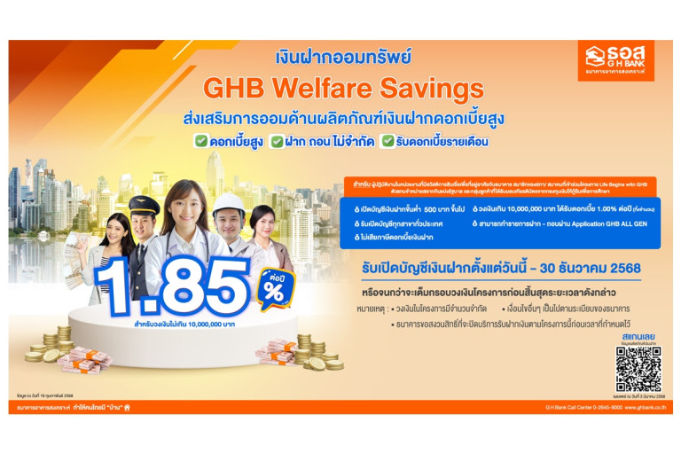ธอส.เอาใจคนรักการออมกับเงินฝากออมทรัพย์ GHB Welfare Savings ให้ผลตอบแทนอัตราดอกเบี้ยสูงถึง 1.85% ต่อปี