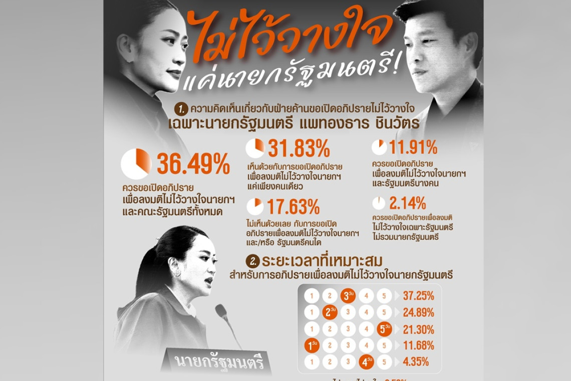 จากการสำรวจเมื่อถามประชาชนถึงความคิดเห็นเกี่ยวกับฝ่ายค้านขอเปิดอภิปรายไม่ไว้วางใจเฉพาะนายกรัฐมนตรี แพทองธาร ชินวัตร พบว่า ตัวอย่าง ร้อยละ 36.49 ระบุว่า ควรขอเปิดอภิปรายเพื่อลงมติไม่ไว้วางใจนายกฯ และคณะรัฐมนตรีทั้งหมด รองลงมา ร้อยละ 31.83 ระบุว่า เห็นด้วยกับการขอเปิดอภิปรายเพื่อลงมติไม่ไว้วางใจนายกฯ แค่เพียงคนเดียว ร้อยละ 17.63 ระบุว่า ไม่เห็นด้วยเลยกับการขอเปิดอภิปรายเพื่อลงมติไม่ไว้วางใจนายกฯ และ/หรือ รัฐมนตรีคนใด ร้อยละ 11.91 ระบุว่า ควรขอเปิดอภิปรายเพื่อลงมติไม่ไว้วางใจนายกฯ และรัฐมนตรีบางคน และร้อยละ 2.14 ระบุว่า ควรขอเปิดอภิปรายเพื่อลงมติไม่ไว้วางใจเฉพาะรัฐมนตรี ไม่รวมนายกรัฐมนตรี