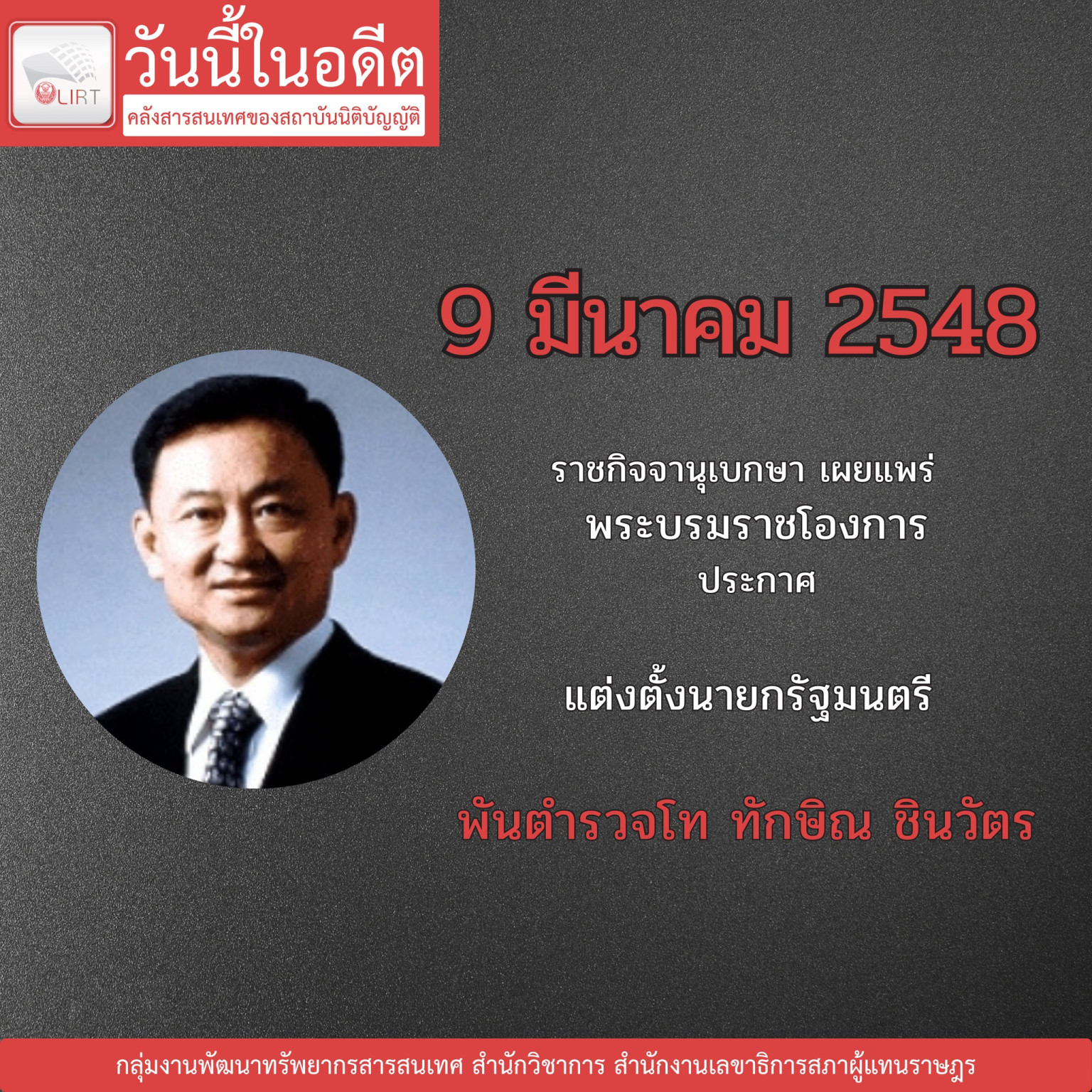 เมื่อวันที่ 9 มี.ค.68 เพจ คลังสารสนเทศของสถาบันนิติบัญญัติ สำนักงานเลขาธิการสภาผู้แทนราษฎร โพสต์ข้อความระบุว่า วันนี้ในอดีต วันที่ 9 มีนาคม 2548 ราชกิจจานุเบกษา เผยแพร่ พระบรมราชโองการ ประกาศ แต่งตั้งนายกรัฐมนตรี [พันตำรวจโท ทักษิณ ชินวัตร]