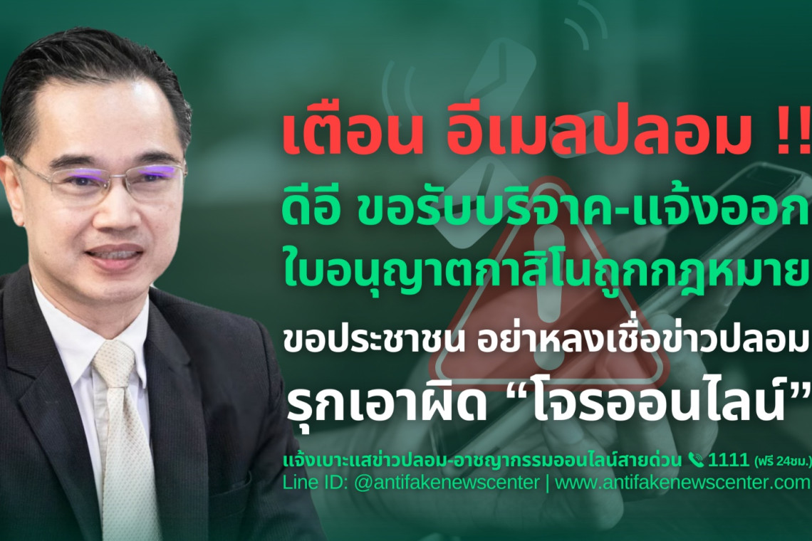 เตือน อีเมลปลอม “ดีอี ขอรับบริจาค-แจ้งออกใบอนุญาตกาสิโนถูกกฎหมาย” ขอ ปชช. อย่าหลงเชื่อ รุกเอาผิด “โจรออนไลน์” สร้างข้อมูลเท็จ
