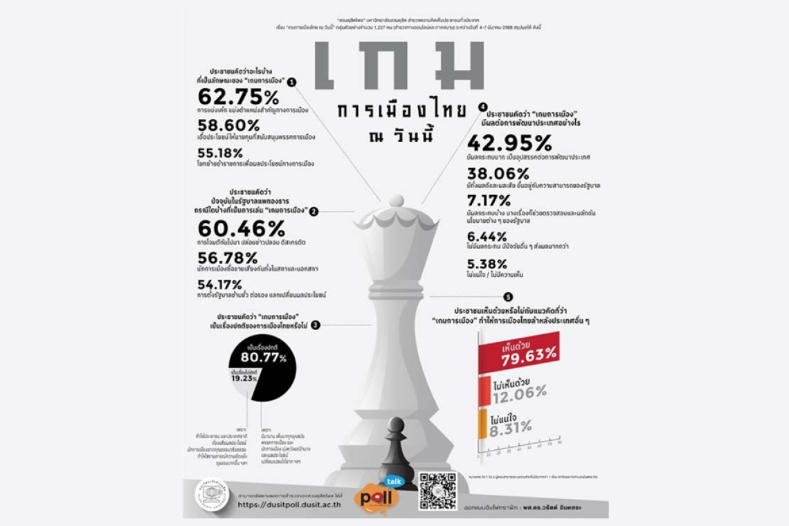 เมื่อวันที่ 9 มี.ค 68 สวนดุสิตโพล จากมหาวิทยาลัยสวนดุสิต เปิดผลสำรวจความคิดเห็นประชาชนทั่วประเทศ จำนวน 1,227 คน (สำรวจทางออนไลน์และภาคสนาม) เรื่อง เกมการเมืองไทย ณ วันนี้ โดยทำการสำรวจระหว่างวันที่ 4-7 มีนาคม 2568 พบว่า ประชาชนส่วนร้อยละ ร้อยละ 62.75 คิดว่าลักษณะของเกมการเมือง คือ การแบ่งเค้ก แบ่งตำแหน่งสำคัญทางการเมือง ร้อยละ 58.60 มองว่าเอื้อประโยชน์ให้นายทุนที่สนับสนุนพรรคการเมือง และร้อยละ 55.18 ระบุโยกย้ายข้าราชการเพื่อผลประโยชน์ทางการเมือง