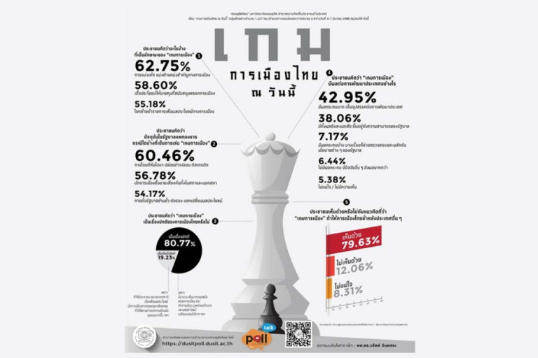 ส่วนประชาชนคิดว่าเกมการเมือง มีผลต่อการพัฒนาประเทศอย่างไร นั้น พบว่า ร้อยละ 42.95 ระบุมีผลกระทบมาก เป็นอุปสรรคต่อการพัฒนาประเทศ และร้อยละ 38.06 ระบุมีทั้งผลดีและผลเสีย ขึ้นอยู่กับความสามารถของรัฐบาล สุดท้ายเมื่อถามว่าเห็นด้วยหรือไม่กับแนวคิดที่ว่า เกมการเมือง ทำให้การเมืองไทยล้าหลังประเทศอื่นๆ พบว่า ร้อยละ 79.63 เห็นด้วย และร้อยละ 12.06 ไม่เห็นด้วย