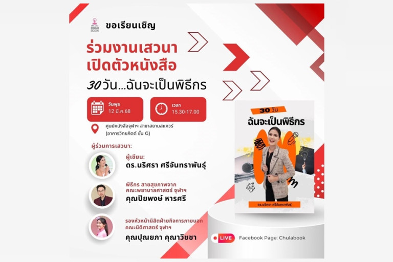 ศูนย์หนังสือจุฬาลงกรณ์มหาวิทยาลัย ขอเชิญร่วมฟังการเสวนา “30 วันสู่เวทีใหญ่: เปลี่ยนคุณให้เป็นพิธีกรมืออาชีพ” พบกับ ดร.นริศรา ศรีจันทราพันธุ์ (อ.ย้วย) : ผู้เขียนหนังสือ "30 วัน...ฉันจะเป็นพิธีกร" พิธีกร 2 ภาษา วิทยากรด้านการพัฒนาบุคลิกภาพ และการสื่อสาร ให้หน่วยงานภาครัฐ ภาคเอกชน สถาบันการศึกษา เป็นอาจารย์พิเศษในมหาวิทยาลัย เคยมีประสบการณ์ในด้านออนไลน์ คอนเทนต์ บรรณาธิการนิตยสาร นักเขียน นักจัดรายการวิทยุ ผู้ประกาศข่าว พิธีกรรายการโทรทัศน์ และครูอาสาสมัครสอนภาษาไทยในสหรัฐอเมริกา ร่วมด้วย คุณปิยพงษ์ หารศรี พิธีกร สายสุขภาพจาก คณะพยาบาลศาสตร์ จุฬาฯ และคุณปุณยภา คุณาวิชชา (มายด์) รองหัวหน้านิสิตฝ่ายกิจการภายนอก คณะนิติศาสตร์ จุฬาฯ