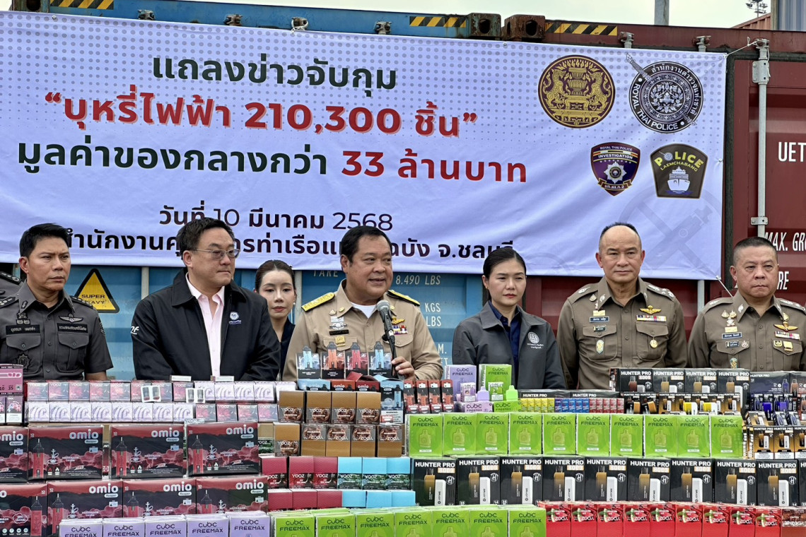 วันที่ 10 มีนาคม 2568 ที่สำนักงานศุลกากรท่าเรือแหลมฉบัง จ.ชลบุรี พันตำรวจเอก ทวี สอดส่อง รัฐมนตรีว่าการกระทรวงยุติธรรม นางสาวจิราพร สินธุไพร รัฐมนตรีประจำสำนักนายกรัฐมนตรี และนายจุลพันธ์ อมรวิวัฒน์ รัฐมนตรีช่วยว่าการกระทรวงการคลัง พันตำรวจตรี ยุทธนา แพรดำ อธิบดีกรมสอบสวนคดีพิเศษ พันตำรวจโท อนุรักษ์ โรจนนิรันดร์กิจ รองอธิบดีกรมสอบสวนคดีพิเศษ พล.ต.อ.ประจวบ วงศ์สุข รองผู้บัญชาการตำรวจแห่งชาติ พล.ต.ท.อัคราเดช พิมลศรี ผู้ช่วย ผู้บัญชาการตำรวจแห่งชาติ พล.ต.ท.ยิ่งยศ เทพจำนงค์ ผู้บัญชาการตำรวจภูธรภาค 2 นายธีรัชย์ อัตนวานิช อธิบดีกรมศุลกากร นายดิเรก คชารักษ์ รองอธิบดีกรมศุลกากร นายวุฒิ เร่งประดุงทอง ผู้อำนวยการสำนักงานศุลกากรท่าเรือแหลมฉบัง แถลงข่าว ยึดบุหรี่ไฟฟ้าลักลอบนำเข้าจากจีนกว่า 200,000 ชิ้น มูลค่า 33 ล้านบาท