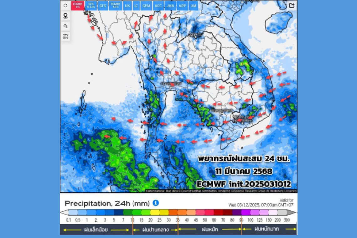 วันที่ 11 มี.ค.68 เพจเฟซบุ๊ก กรมอุตุนิยมวิทยา โพสต์ข้อความเตือนสภาพอากาศ ระบุว่า...อัพเดทผลการพยากรณ์ฝนสะสมรายวัน (ทุกๆ 24 ชม.:(นับตั้งแต่ 07.00น. ถึง 07.00น.วันรุ่งขึ้น) และลมที่ระดับ 925hPa (750 ม.)15 วันล่วงหน้า ระหว่าง 11-25 มี.ค.68 init. 2025031012 จากศูนย์พยากรณ์อากาศระยะกลางยุโรป (ECMWF) วิเคราะห์ตามผลจากแบบจำลองฯ เฉดสีแดงหมายถึงฝนหนัก สีเขียวหมายถึงฝนเล็กน้อย :