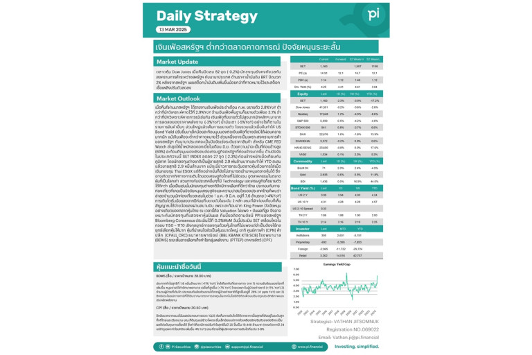 เมื่อวันที่ 13 มี.ค.68 บล.พาย เผยว่า ตลาดหุ้น Dow Jones เมื่อคืนปิดลบ 82 จุด (-0.2%) นักลงทุนยังคงกังวลกับสงครามการค้าระหว่างสหรัฐฯกับนานาประเทศ ด้านราคาน้ำมันดิบ BRT ปิดบวก 2% หลังจากสหรัฐฯเผยสต็อกน้ำมันดิบเพิ่มขึ้นน้อยกว่าที่คาดหมายไว้และสต็อกเชื้อเพลิงปรับตัวลดลง