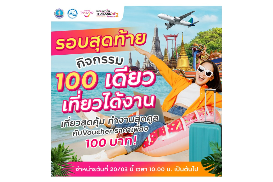 รอบสุดท้ายกับกิจกรรมส่งเสริมการขาย “100 เดียวเที่ยวได้งาน” ซึ่งเป็นกิจกรรมที่นำเสนอสินค้าและบริการด้านการท่องเที่ยวในราคาเพียง 100 บาท เพื่อส่งเสริมการตลาดและกระตุ้นให้เกิดการเดินทางท่องเที่ยวภายในประเทศในวันธรรมดา อีกทั้งยังเป็นการสร้างรายได้ให้กับผู้ประกอบการในอุตสาหกรรมท่องเที่ยว และในรอบสุดท้ายนี้จะเปิดให้นักท่องเที่ยวเข้าร่วมกิจกรรมได้ในวันที่ 20 มีนาคม 2568 และสามารถเลือกซื้อ Voucher ได้ตั้งแต่เวลา 10.00 น. เป็นต้นไป (หรือจนกว่าสินค้าจะหมด) First Come First Serve มาก่อน เลือกก่อน ได้ก่อน ผ่านเว็บไซต์ www.tourismthailand.org/workationthailand ซึ่งมีบัตรกำนัล (Voucher) สินค้าและบริการด้านการท่องเที่ยวที่นำเสนอขายมากมาย หลากหลายประเภท เช่น ประเภทโรงแรมที่พัก อาทิ การยา ท้องทราย เบย์ สมุย ครอส ริเวอร์แคว รีสอร์ท ศิลป์ บูทีค โฮเทล วาลา ชะอำ - นู แชปเตอร์ โฮเทล อลีนตา หัวหิน - ปราณบุรี แชปเตอร์ โฮเทล ป่าทำมา ไฮด์อเวย์ รีสอร์ท เซนศาลา ริเวอร์พาร์ค รีสอร์ท พลูแมนเขาหลัก รีสอร์ท และคาทิลิยาเมาท์เทนรีสอร์ทแอนด์สปา ประเภทกิจกรรมท่องเที่ยวและแพ็กเกจท่องเที่ยว อาทิ วานา นาวา วอเตอร์ จังเกิ้ล พิพิธภัณฑ์ ริบลีส์ เชื่อหรือไม่ และโอเอซิสสปา เป็นต้น ทั้งนี้ยังมี บัตรกำนัล (Voucher) สินค้าและบริการด้านการท่องเที่ยวจากสถานประกอบการชั้นนำที่เข้าร่วมกิจกรรมอีกมากมายให้นักท่องเที่ยวได้เลือกซื้อ
