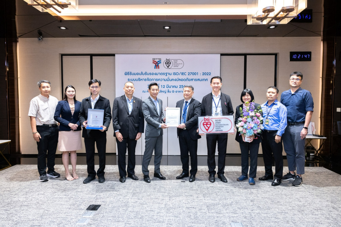 เมื่อวันที่ 12 มีนาคม 2568 ที่ผ่านมา นายสุรพงษ์ เลาหะอัญญา กรรมการผู้อำนวยการใหญ่ บริษัท ระบบขนส่งมวลชนกรุงเทพ จำกัด (มหาชน) ผู้ให้บริการรถไฟฟ้าบีทีเอส รับมอบใบรับรองระบบบริหารจัดการความมั่นคงปลอดภัยสารสนเทศ ISO/IEC 27001:2022 จากบริษัท บีเอสไอ กรุ๊ป (ประเทศไทย) จำกัด อาคารบีทีเอส สำนักงานใหญ่ ซึ่งการรับมอบใบรับรองฯ ISO/IEC 27001:2022 ในครั้งนี้ แสดงให้เห็นถึงความมุ่งมั่นของบริษัทฯ ที่ให้ความสำคัญกับความมั่นคงปลอดภัยสารสนเทศ โดยระบบต้องมีความถูกต้อง ความพร้อมใช้ และการรักษาความลับ