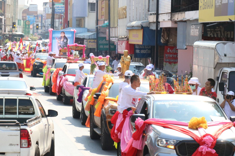 วันที่ 14 มีนาคม 2567 เวลา 09.09 น. ที่บริเวณหน้าวัดบูรพ์ ถนนจอมพล ต.ในเมือง อ.เมือง จ.นครราชสีมา มูลนิธิพุทธธรรม 31 นครราชสีมา (พ้งไล้จับเก้าเซียวเกาะ) โดยนายประวิทย์ อัศวินชัย ประธานมูลนิธิ ฯ พร้อมคณะกรรมการและกลุ่มผู้แสวงบุญกว่า 1 พันคน จัดริ้วขบวนแห่อัญเชิญกระถางธูปทองตังลิ้วฮุกกง -โป๊ยจุงเซี้ยฮุก องค์เทพเจ้าสิ่งศักดิ์สิทธิ์ทุกพระองค์จากศาลเจ้าในเขต อ.เมือง และริ้วขบวนธง ล้อโก้ว สิงโตตามเสด็จ (เซี้ยแก่ฮุกอิ้ว) และสิ่งศักดิ์สิทธิ์ทุกพระองค์จากศาลเจ้าในเขตเมืองแห่รอบเขตเทศบาลนคร (ทน.) นครราชสีมา เพื่อเสริมสร้างสิริมงคลและปัดเป่าสิ่งชั่วร้าย ตลอดเส้นทางพบคนไทยเชื้อสายจีนตั้งโต๊ะบริเวณหน้าบ้าน เพื่อกราบไหว้สักการะขอพรให้เป็นสิริมงคล บรรยากาศชื่นมื่น