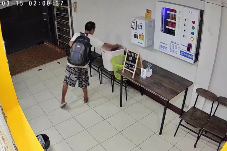 โดยภาพวงจรปิดจะเห็นได้ว่าเมื่อเวลา 01.58 น. วันที่ 15 มี.ค.68มีผู้ชายอายุราว 30-40 ปี สวมเสื้อสีขาว ใส่กางเกงขาสั้นลายขาวดำ และถือกระเป่าเป้สีดำ ได้เดินเข้ามาในร้านอย่างใจเย็น ก่อนภาพจากวงจรปิดจะไม่สามารถจับภาพได้นานกว่า 2 นาที และเดินออกมาทำท่าครุ่นคิดมองหาของที่จะขโมยและคิดไม่ออก ซึ่งก่อนเดินออกไปได้มองเห็นตระกร้าผ้าของลูกค้าที่นำมาซักมีเสื้อผ้าจึงมองซ้ายขวาก่อนทำการหยิบกางเกงไป 1 ตัว โดยลักษณะคนร้ายเดินอย่างใจเย็นและตีเนียนอย่างมาก