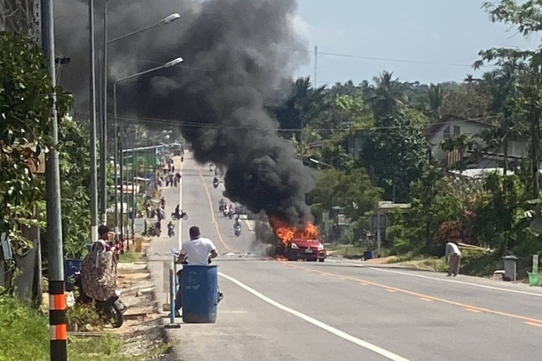 โจรใต้ป่วนไม่หยุด ลองวางคาร์บอมบ์บึ้มดังสนั่น “อส.”ถูกสะเก็ดระเบิดกัดฟันวิ่งหนี หลังไฟลุกโชนไหม้วอดรถทั้งคัน เจ้าหน้าที่เร่งลงพื้นที่ช่วยเหลือ