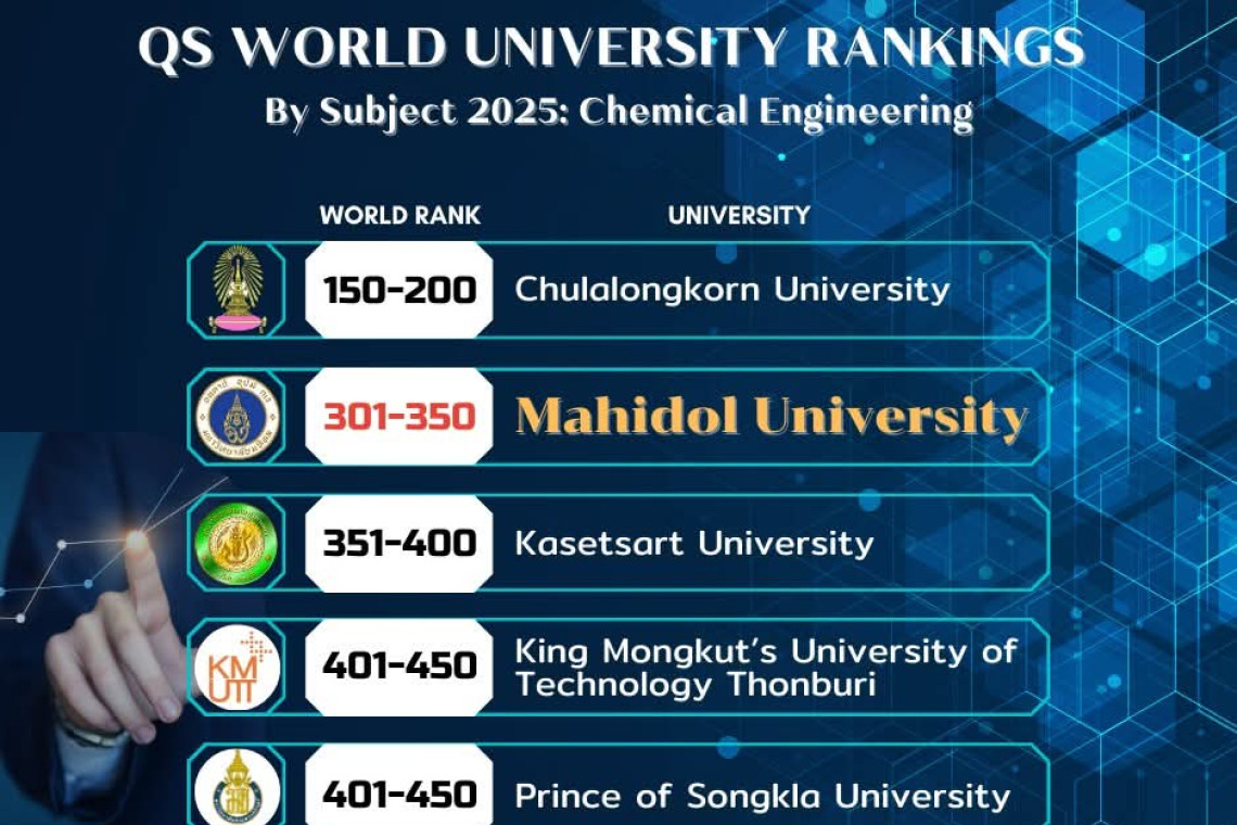 วันที่ 18 มี.ค.2568-เพจ Chemical Engineering Mahidol UNivercity ได้โพสต์ข้อความว่าวิศวกรรมเคมี มหาวิทยาลัยมหิดล ได้รับการจัดอันดับในกลุ่มสาขา Engineering & Technology: Chemical Engineering เป็นลำดับที่ 2 ของประเทศไทยและอันดับ 301-350 ของโลก จากผลการจัดอันดับมหาวิทยาลัยชั้นนำของโลกในสาขาวิชาต่างๆ โดย QS World University Rankings by Subject 2025: Chemical Engineering ซึ่งประกาศผลเมื่อวันที่ 12 มีนาคม 2568