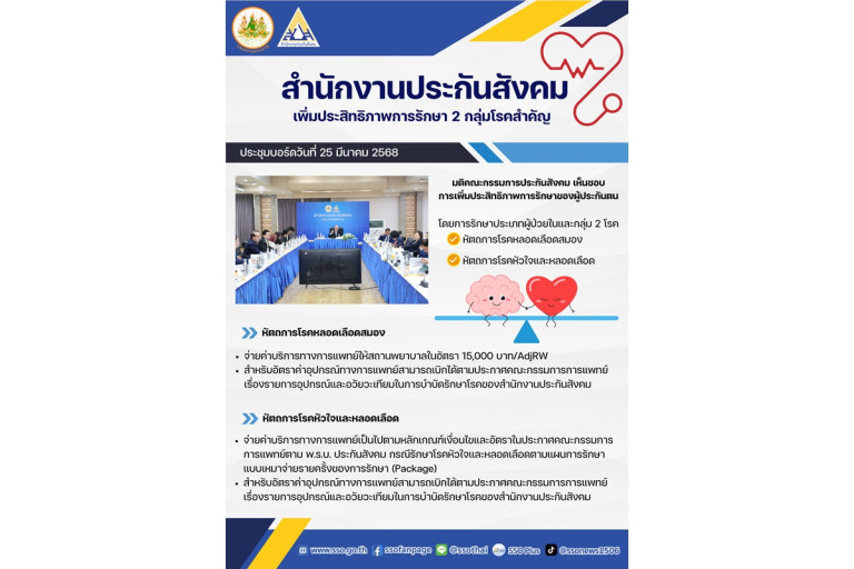 นางมารศรี ใจรังษี เลขาธิการสำนักงานประกันสังคม เปิดเผยว่า สำนักงานประกันสังคมได้เห็นชอบการเพิ่มประสิทธิภาพการเข้าถึงการรักษาของผู้ประกันตน ในระบบประกันสังคม ร่วมกับสถานพยาบาลที่มีศักยภาพตามเกณฑ์ที่สำนักงานกำหนด ซึ่งเป็นการลดระยะเวลาการรอคอย ลดระยะเวลาในการพักฟื้น ลดภาวะแทรกซ้อน ไม่ให้อาการของโรคมีความรุนแรงมากขึ้น รวมถึงลดอัตราการเสียชีวิต ใน 2 กลุ่มโรคสำคัญ ได้แก่ หัตถการโรคหลอดเลือดสมอง โดยรักษาหลอดเลือดสมองตีบ หรืออุดตันด้วยการทำหัตถการ Thrombectomy ภายใน 6 ชั่วโมง นับตั้งแต่ที่มาถึงโรงพยาบาล และหัตถการโรคหัวใจและหลอดเลือด มี 7 หัตถการ กรณีโรคกล้ามเนื้อหัวใจขาดเลือดเฉียบพลัน อาการฉุกเฉิน (emergency) ทำหัตถการภายใน 60 นาที (door to balloon time) โดยสำนักงานประกันสังคมจะรับผิดชอบค่าบริการทางการแพทย์โดยตรงกับสถานพยาบาล ผู้ประกันตนไม่ต้องเสียค่าใช้จ่ายในการรับบริการแต่อย่างใด สำหรับระยะเวลาดำเนินโครงการตั้งแต่วันที่ 1 เมษายน ถึง 31 ธันวาคม 2568