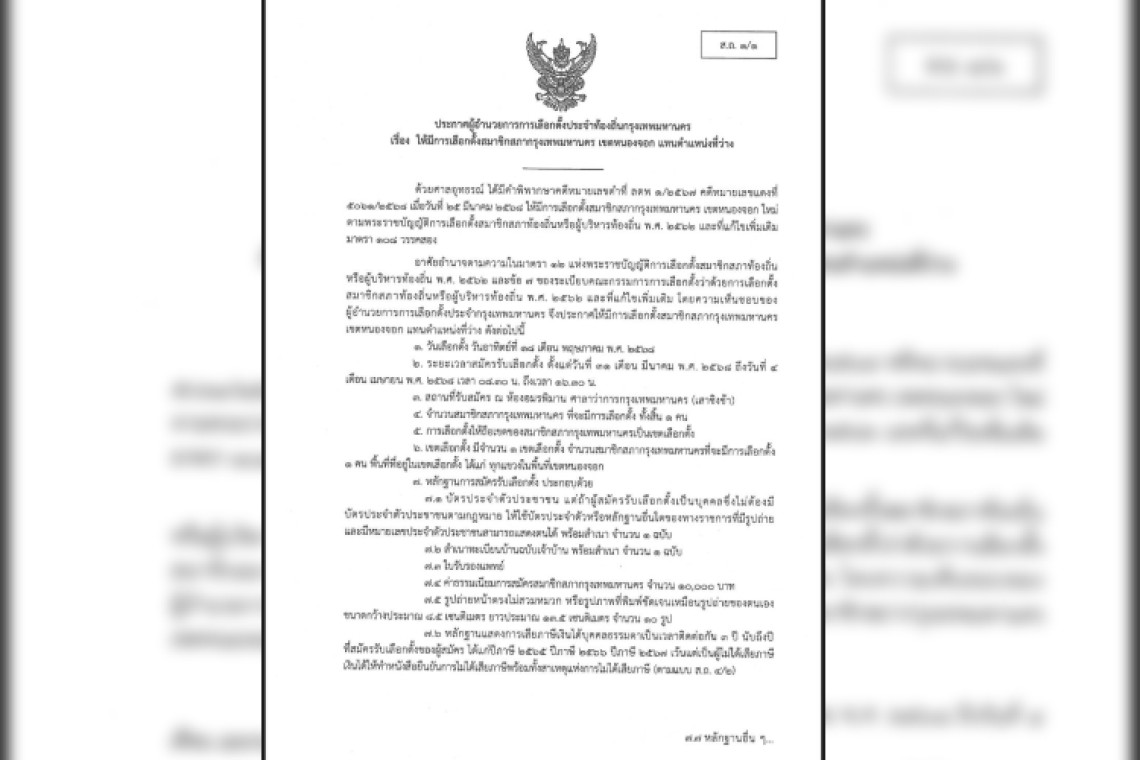 ผอ. เลือกตั้งท้องถิ่น กทม. ประกาศวันเลือกตั้ง สก. เขตหนองจอก แทนตำแหน่งที่ว่าง 18 พ.ค.นี้ เปิดรับสมัคร 31 มี.ค. – 4 เม.ย. ที่ กทม. เสาชิงช้า