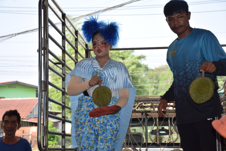 วันที่ 27 มีนาคม 2568 แผงรับซื้อทุเรียน “เจ้ สั่งลุย นครศรีฯ” ตั้งอยู่ริมถนน 3277 สายมะขาม - ขลุง ต.มะขาม อ.มะขาม จ.จันทบุรี ได้สร้างสีสันในวงการค้าทุเรียน ด้วยการใช้กลยุทธ์ที่ไม่เหมือนใคร โดยดึงนางเอกลิเกชื่อดัง "ดำดง" มาร่วมโบกรถขอซื้อทุเรียนจากชาวสวนที่ขับผ่านริมถนน พร้อมกับการเต้นตามจังหวะเพลงแดนซ์สายย่อ ที่เพิ่มความสนุกสนานให้กับบรรยากาศ การแสดงออกนี้ทำให้ผู้ขับขี่รถยนต์ที่ผ่านไปผ่านมาหยุดชะลอรถและยิ้มให้กับการแสดงที่เต็มไปด้วยความสดใส แม้จะไม่มีทุเรียนขายก็ตาม