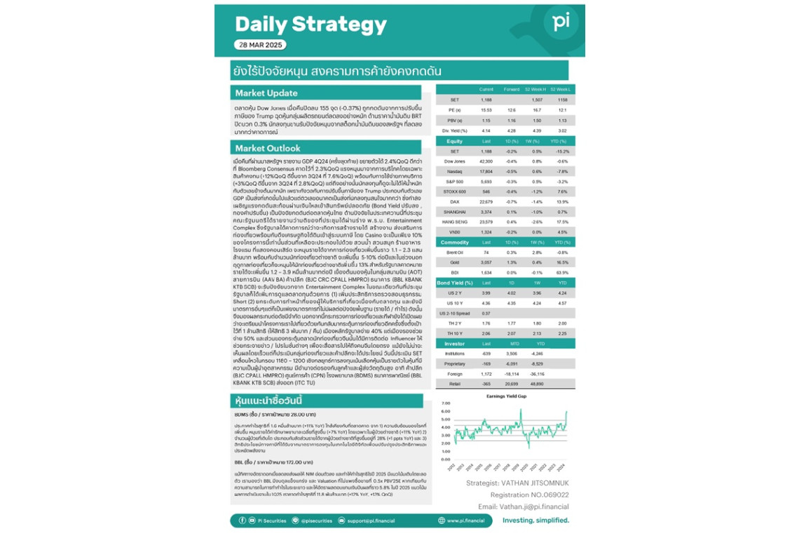 วันที่ 28 มีนาคม 2568 บ,งพาย เผยว่า ตลาดหุ้น Dow Jones เมื่อคืนปิดลบ 132 จุด (-0.3%) นักลงทุนกังวลกับสงครามการค้าเพราะล่าสุด Trump ได้ประกาศขึ้นภาษีรถยนต์ในอัตรา 25% ซึ่งจะมีผลบังคับใช้ในวันที่ 2 เม.ย. ด้านราคาน้ำมันดิบ BRT ปิดบวก 1% ปัจจัยหนุนจากสต็อกน้ำมันดิบที่ลดลงมากกว่าคาดการณ์ในสัปดาห์ก่อน