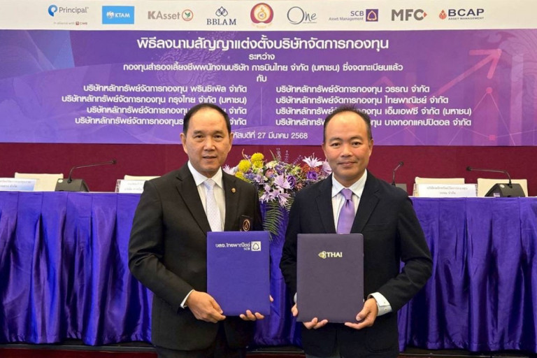 บริษัท การบินไทย จำกัด (มหาชน) โดย นายชาย เอี่ยมศิริ ประธานเจ้าหน้าที่บริหาร (ซ้าย) และ บริษัทหลักทรัพย์จัดการกองทุน ไทยพาณิชย์ จำกัด (บลจ. ไทยพาณิชย์) โดย นายณรงค์ศักดิ์ ปลอดมีชัย ประธานเจ้าหน้าที่บริหาร (ขวา) ร่วมลงนามสัญญาการแต่งตั้งให้ บลจ. ไทยพาณิชย์ เป็นหนึ่งในผู้บริหารจัดการกองทุนสำรองเลี้ยงชีพสำหรับพนักงานการบินไทย ความร่วมมือในครั้งนี้ สะท้อนถึงความเชื่อมั่นในประสบการณ์ ความเชี่ยวชาญ และความเป็นมืออาชีพของ บลจ. ไทยพาณิชย์ ในการบริหารจัดการการลงทุนให้แก่สมาชิกกองทุนสำรองเลี้ยงชีพ เพื่อรองรับความมั่นคงทางการเงินของพนักงานในอนาคต ซึ่งถือเป็นเครื่องพิสูจน์ถึงความเชื่อมั่นจากลูกค้าระดับองค์กรชั้นนำ