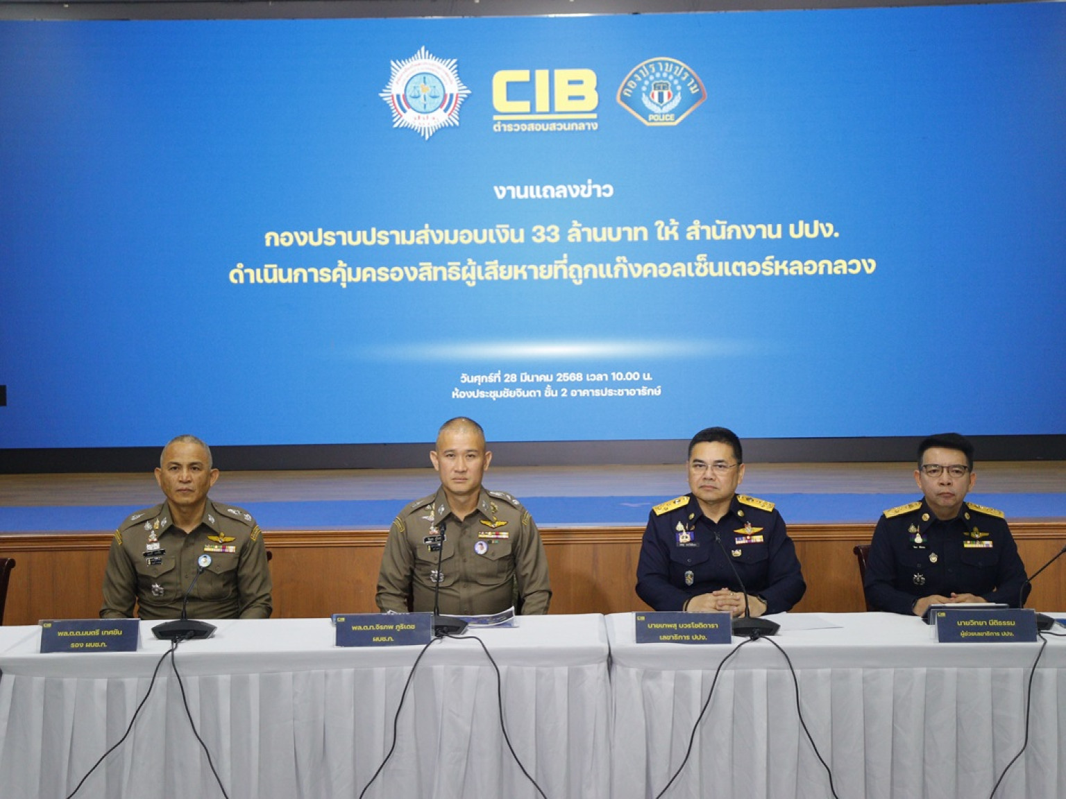 วันที่ 28 มี.ค.68 เวลา 10.00 น. ที่ กองบังคับการปราบปราม (บก.ป.) พล.ต.ท.จิรภพ ภูริเดช ผบช.ก. พร้อมด้วย พล.ต.ต.มนตรี เทศขัน รอง ผบช.ก. ,พล.ต.ต.วิทยา ศรีประเสริฐภาพ ผบก.ป. เป็นตัวแทนส่งมอบเงินจำนวน 33 ล้านบาท ให้แก่สำนักงานป้องกันและปราบปรามการฟอกเงิน (สำนักงาน ปปง.) เพื่อคุ้มครองสิทธิ์ผู้เสียหายในความผิดมูลฐานฉ้อโกงประชาชน หรือผู้เสียหายที่ถูกแก๊งคอลเซ็นเตอร์หลอกลวง โดยมีนายเทพสุ บวรโชติดารา เลขาธิการ สำนักงานป้องกันและปราบปรามการฟอกเงิน (ปปง.) เป็นผู้แทนรับมอบ