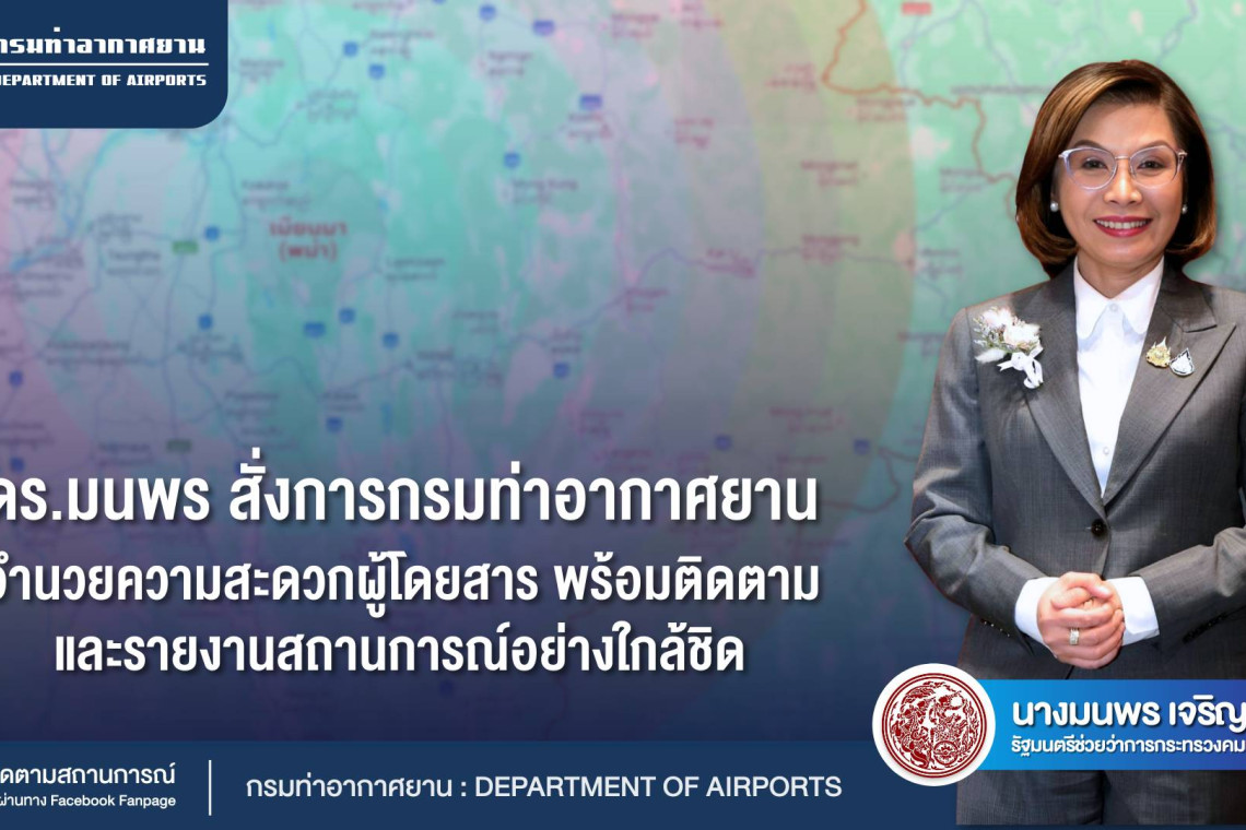จากสถานการณ์แผ่นดินไหว วันนี้เมื่อช่วงบ่ายที่ผ่านมา ดร.มนพร เจริญศรี รัฐมนตรีช่วยว่าการกระทรวงคมนาคม สั่งการกรมท่าอากาศยานตรวจสอบความเสียหายของโครงสร้างพื้นฐาน และระบบการให้บริการท่าอากาศยานในสังกัด รวมถึงอำนวยความสะดวกแก่ผู้โดยสารที่อาจได้รับผลกระทบจากเที่ยวบินล่าช้า