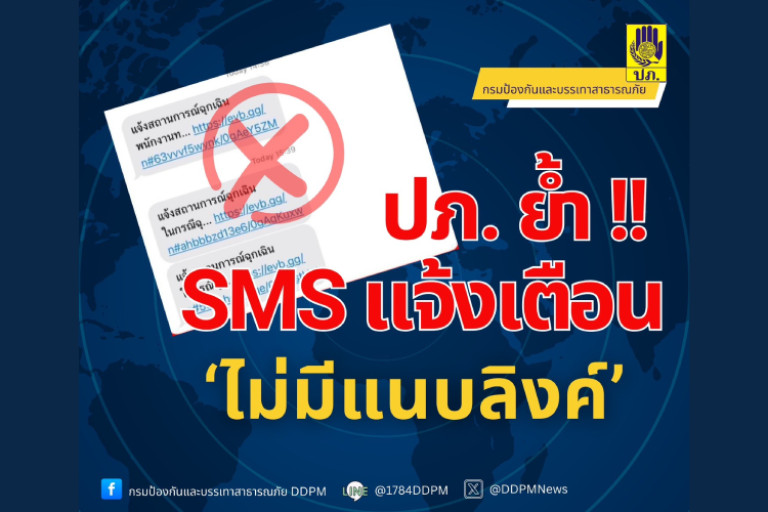 ล่าสุด กรมป้องกันและบรรเทาสาธารณภัย DDPM ออกข้อความเตือน ระบุว่า ... ปภ.ย้ำอีกครั้ง‼️ ข้อความ sms แจ้งเตือนภัย  จะส่งในชื่อ “DDPM” เท่านั้น และข้อความ “ไม่มีการแนบลิงก์” ให้ประชาชนกดอ่านข้อมูลเพิ่มเติมหรือลงทะเบียน ซึ่งหากข้อความที่ประชาชนได้รับมีการส่งลิงก์แนบไปด้วย ขอให้สันนิษฐานว่าข้อความดังกล่าวเป็นข้อความจากมิจฉาชีพ และขออย่ากดลิงก์ดังกล่าวโดยเด็ดขาด