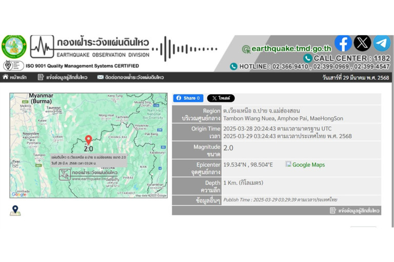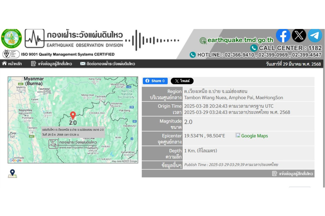 เมื่อวันที่ 29 มีนาคม 2568 ผู้สื่อข่าวรายงาน กรมอุตุนิยมวิทยา รายงานเกิดแผ่นดินไหว บริเวณศูนย์กลาง ต.เวียงเหนือ อ.ปาย จ.แม่ฮ่องสอนTambon Wiang Nuea, Amphoe Pai, MaeHongSon https://earthquake.tmd.go.th/inside-info.html… Magnitude ขนาด 2.0 ซึ่งเกิดกลางดึกวันที่ 29 มีนาคม 2568 เวลา 03.24 น.