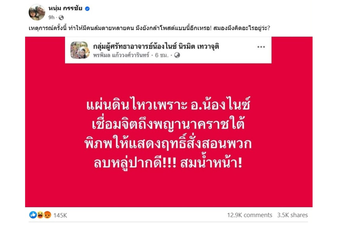เมื่อวันที่ 29 มี.ค.68 เพจเฟซบุ๊ก "หนุ่ม กรรชัย" โพสต์รูปจากเพจเฟซบุ๊ก "กลุ่มผู้ศรัทธาอาจารย์น้องไนท์" ที่ออกมาโพสต์ข้อความ ระบุว่า "แผ่นดินไหวเพราะ อ.น้องไนซ์เชื่อมจิตถึงพญานาคราชใต้พิภพให้แสดงฤทธิ์สั่งสอนพวกลบหลู่ปากดี!!! สมน้ำหน้า!"