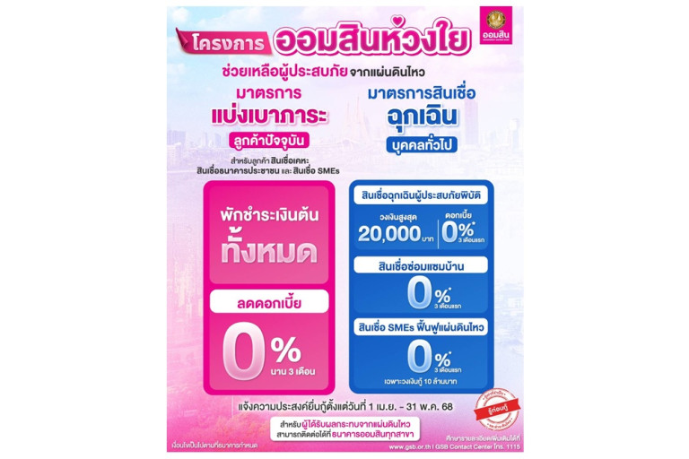 ออมสิน เร่งช่วยเหลือผู้ประสบเหตุแผ่นดินไหวที่ได้รับผลกระทบ ทั้งรายย่อยและผู้ประกอบการลูกค้าเดิม“พักจ่ายต้น ลดดอกเบี้ย 0% นาน 3 เดือน” และมอบสินเชื่อฉุกเฉิน ซ่อมบ้าน และ SME