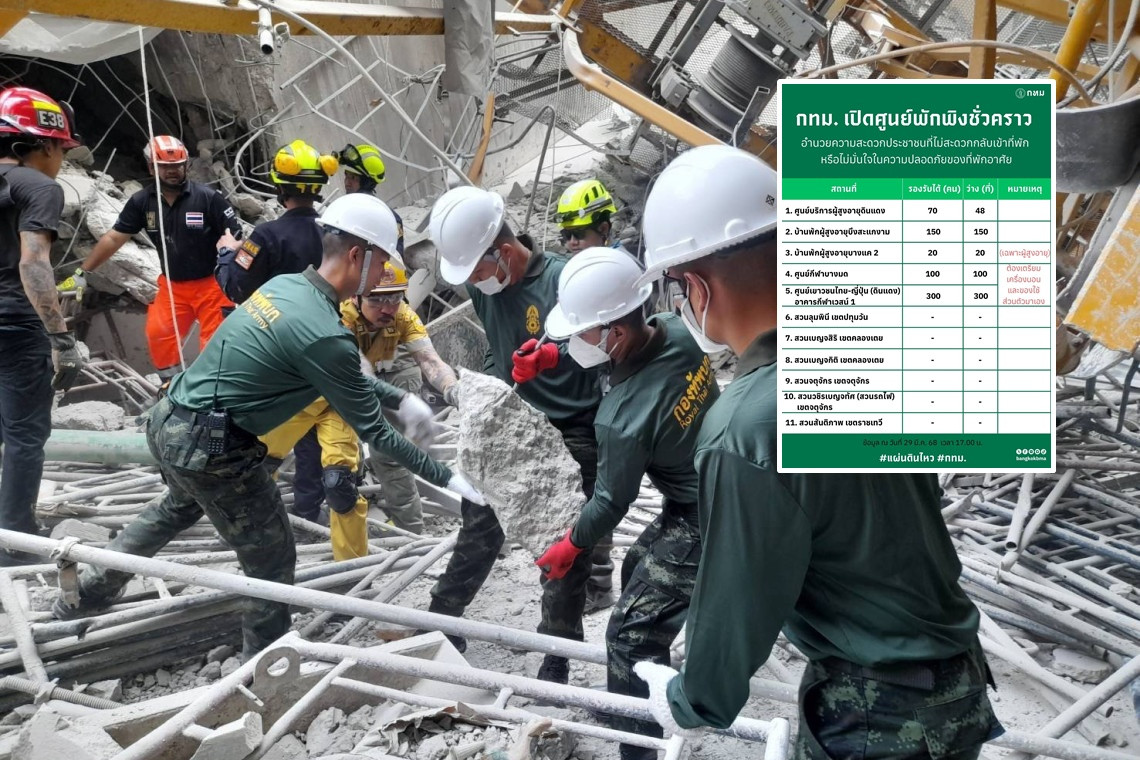 29 มีนาคม 2568 19:02 น. สยามรัฐออนไลน์ กทม. เมื่อวันที่ 29 มี.ค.68 เพจ กรุงเทพมหานคร โพสต์เฟสบุ๊กระบุว่า อัปเดตรายชื่อศูนย์พักพิงชั่วคราว 11 แห่ง เพื่อรองรับประชาชนที่ได้รับผลกระทบจากเหตุแผ่นดินไหว #แผ่นดินไหว #กทม
