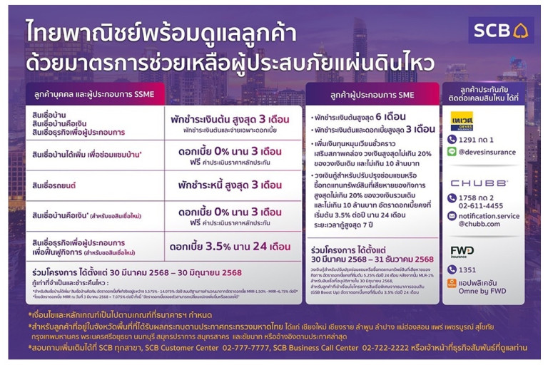;YOMUJ 30 ,UOK8, 2568จากเหตุการณ์แผ่นดินไหวเมื่อวันที่ 28 มีนาคม 2568 ได้สร้างความเสียหายส่งผลกระทบต่อทรัพย์สินและความเป็นอยู่ของประชาชนในหลายพื้นที่ของประเทศไทย ธนาคารไทยพาณิชย์มีความห่วงใยลูกค้าและพร้อมอยู่เคียงข้างให้การช่วยเหลือและบรรเทาความเดือดร้อนให้แก่ลูกค้าผู้ได้รับผลกระทบจากอุบัติภัยครั้งนี้ ด้วยมาตรการเร่งด่วน ครอบคลุมทั้งลูกค้าบุคคล ลูกค้าผู้ประกอบการเอสเอ็มอีอย่างเต็มที่ ทั้งการพักชำระเงินกู้แก่ลูกค้าปัจจุบัน และให้สินเชื่อใหม่เพื่อการซ่อมแซมที่อยู่อาศัย และฟื้นฟูกิจการที่ได้รับผลกระทบ ประกอบด้วย ดังนี้