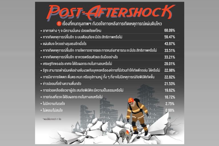 จากการสำรวจเมื่อถามถึงเรื่องที่คนกรุงเทพมหานครกังว ลใจภายหลังการเกิดเหตุการณ์แผ่นดินไหว พบว่า ตัวอย่าง ร้อยละ 68.09 ระบุว่า อาคารต่าง ๆ จะมีความมั่นคง ปลอดภัยแค่ไหน รองลงมา ร้อยละ 59.47 ระบุว่า หากเกิดเหตุการณ์ขึ้นอีก ระบบเตือนภัยจะมีประสิทธิภาพหรือไม่ ร้อยละ 43.97 ระบุว่า แผ่นดินจะไหวอย่างรุนแรงอีกเมื่อไร ร้อยละ 33.51 ระบุว่า หากเกิดเหตุการณ์ขึ้นอีก การจัดการจราจรและการขนส่งสาธารณะจะมีประสิทธิภาพหรือไม่ ร้อยละ 33.21 ระบุว่า หากเกิดเหตุการณ์ขึ้นอีก เราควรเตรียมตัวและรับมืออย่างไร ร้อยละ 29.01 ระบุว่า เศรษฐกิจของประเทศจะได้รับผลกระทบในทางลบหรือไม่ ร้อยละ 22.98 ระบุว่า รัฐจะสามารถดำเนินคดีอย่างเข้มงวด