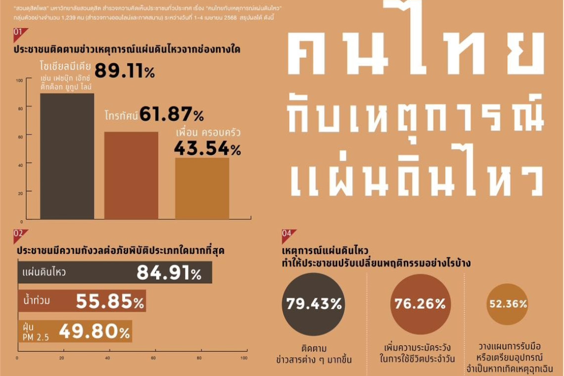 6 เมษายน 2568 “สวนดุสิตโพล” มหาวิทยาลัยสวนดุสิต สำรวจความคิดเห็นประชาชนทั่วประเทศ เรื่อง “คนไทยกับเหตุการณ์แผ่นดินไหว” กลุ่มตัวอย่างจำนวน 1,239 คน (สำรวจทางออนไลน์และภาคสนาม) ระหว่างวันที่ 1-4 เมษายน 2568 สรุปผลได้ ดังนี้ 1. ประชาชนติดตามข่าวเหตุการณ์แผ่นดินไหวจากช่องทางใด อันดับ 1 โซเชียลมีเดีย เช่น เฟซบุ๊ก เอ๊กซ์ ติ๊กต็อก ยูทูป ไลน์ 89.11% อันดับ 2 โทรทัศน์ 61.87% อันดับ 3 เพื่อน ครอบครัว 43.54% 2. ประชาชนมีความกังวลต่อภัยพิบัติประเภทใดมากที่สุด อันดับ 1 แผ่นดินไหว 84.91% อันดับ 2 น้ำท่วม 55.85% อันดับ 3 ฝุ่น PM 2.5 49.80% 3. จากเหตุการณ์แผ่นดินไหวครั้งนี้ ประชาชนมีความกังวลต่อความปลอดภัยและผลกระทบที่อาจเกิดขึ้นในอนาคต มากน้อยเพียงใด อันดับ 1 ค่อนข้างกังวล 48.83% อันดับ 2 กังวลมาก 41.40% อันดับ 3 ไม่ค่อยกังวล 8.47% อันดับ 4 ไม่กังวลเลย 1.30% 4. เหตุการณ์แผ่นดินไหวทำให้ประชาชนปรับเปลี่ยนพฤติกรรมอย่างไรบ้าง อันดับ 1 ติดตามข่าวสารต่างๆมากขึ้น 79.43% อันดับ 2 เพิ่มความระมัดระวังในการใช้ชีวิตประจำวัน 76.26% อันดับ 3 วางแผนการรับมือหรือเตรียมอุปกรณ์จำเป็นหากเกิดเหตุฉุกเฉิน 52.36% 5. ข้อเสนอแนะต่อรัฐบาลและหน่วยงานที่เกี่ยวข้องในการรับมือกับภัยพิบัติในอนาคต อันดับ 1 มีระบบติดตาม แจ้งเตือนภัยพิบัติที่รวดเร็ว แม่นยำ 72.18% อันดับ 2 ยกระดับเรื่องภัยพิบัติเป็นวาระแห่งชาติ 45.10% อันดับ 3 จัดตั้งหน่วยงานช่วยเหลือป้องกันภัยเฉพาะกิจ มีงบประมาณสนับสนุนเพียงพอ 40.45% อันดับ 4 ให้ความรู้แก่ประชาชนในการรับมือ เอาตัวรอด 28.82% อันดับ 5 ควรตรวจสอบความปลอดภัยและโครงสร้างของอาคารทุกประเภทอย่างเข้มงวด 21.01% อื่นๆ เพิ่มค่าตอบแทนให้เจ้าหน้าที่ผู้ปฏิบัติงานด้านภัยพิบัติ สร้างขวัญกำลังใจ ฯลฯ 6.73%