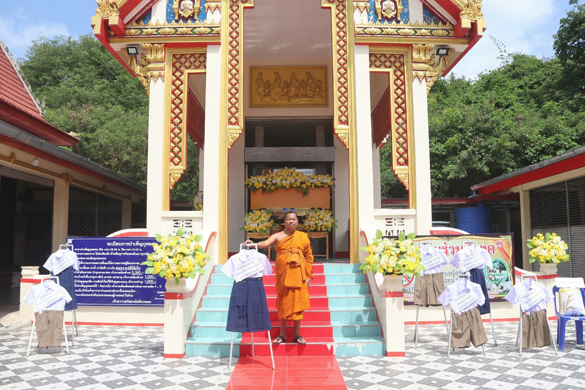อีกทั้งยังกล่าวต่ออีกว่า ซึ่งในปัจจุบัน เศรษฐกิจใม่ค่อยดี การค้าขายไม่ค่อยดี ลูกหลานเรียนหนังสือปัจจัยก็น้อย เลยมีความคิดที่จะเพิ่มอีกอย่าง คือชุดนักเรียน จึงติดต่อไปยังลูกศิยษ์ หรือคนที่รู้จักมักคุ้น ขอเป็นเจ้าภาพชุดนักเรียนเพื่อจะทำเป็นพวงรีดตัวอย่างให้กับญาติโยม ซึ่งญาติโยมก็ช่วยมากกว่า10 ชุด จึงเปลี่ยนพวกรีดดอกไม้ เป็นพวงรีดชุดนักเรียนทั้งหมด และก็ได้ใช้ประโยชน์แบบเห็นได้ชัดเจน มีนักเรียนมาขอกับทางวัดเรียบร้อย และญาติโยมตอนนี้ สั่ง พวงรีดชุดนักเรียนจำนวนมาก