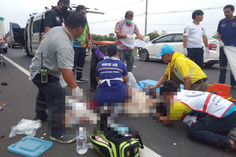 รถโดยสารประจำทางสายสุรินทร์-กรุงเทพฯเฉี่ยวชนกับรถมอเตอร์ไซค์ข้างถนนนอนร้องครวญครางด้วยความเจ็บปวด ยังไม่สรุปแน่ชัดใครผิดใครถูกเพราะมีคู่กรณี 3 คน