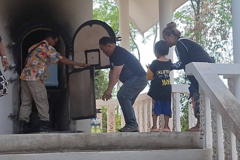 น้ำตาท่วมวัดเผาแล้วเมียเหยื่อเคราะห์ร้ายหนุ่มหลอนยาแทงทั่วร่าง ส่วนแม่แท้ๆ แขนหวิดขาดอาการยังสาหัส วันนี้แม่คนตายและชาวบ้านทำพิธีฌาปนกิจศพ หัวอกคนเป็นแม่ลูกสาวตายร่ำไห้ยังผวาลูกเขยออกจากคุกมามาฆ่าแน่เคยขู่เอาไว้ หลอนยาหนักคิดเห็นหน้าเมียเป็นหน้าแม่ยาย งานศพขนลุกน้องลิลล่าลูกสาววัย 4 ขวบโบกมือลาแม่ถูกพ่อตายเป็นครั้งสุดท้าย เห็นแม่ยืนโลงศพโบกมือลาครั้งสุดท้ายด้วย