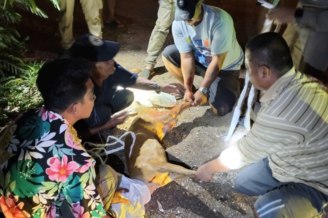 จึงนำกำลังเดินทางไปตรวจสอบ พร้อมประสานเจ้าหน้าที่อาสาสมัครมูลนิธิกู้ภัยกาญจนบุรี ร่วมกับเจ้าหน้าที่ตำรวจ สภ.ทองผาภูมิ และเจ้าหน้าที่เทศบาลตำบลทองผาภูมิเข้าทำการช่วยเหลือพบว่า มีเก้งสัตว์ป่าสงวนเพศเมียคาดว่าลงมาหาอาหารแล้วเกิดผลัดหลงออกจากป่า ถูกสุนัขไล่กวดทำร้ายบริเวณท่อนขาขวาด้านหลัง มีร่องรอยบาดแผลฉกรรจ์ เจ้าหน้าที่จึงทำการช่วยเหลือเบืองต้น ก่อนจะนำส่งให้กับเจ้าหน้าที่อุทยานแห่งชาติเขาแหลมเพื่อดำเนินการรักษาอาการ แต่สุดท้ายเก้งตัวดังกล่าวก็เสียชีวิตในเวลาต่อมาคาดว่าคงทนพิษบาดแผลไม่ไหว เจ้าหน้าที่อุทยานแห่งชาติฯ จึงนำซากเก้งไปทำการฝังกลบตามระเบียบต่อไป