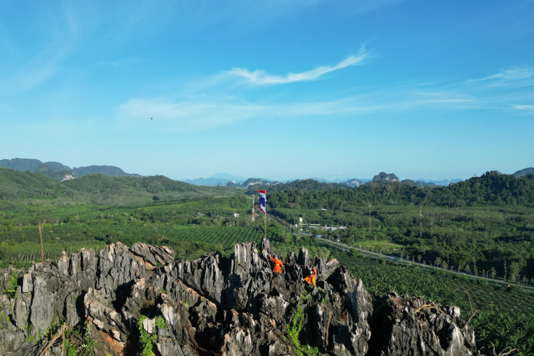 พังงาหลวงพี่ใจถึงขึ้นปักธงชาติบนยอดเขาวัดสุวรรณคูหา จุดท่องเที่ยวทางประวัติศาสตร์ยอดนิยมของจังหวัดพังงา