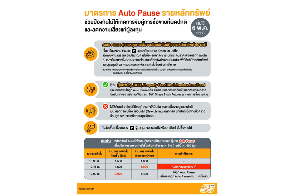 ทั้งนี้ มาตรการ Auto Pause รายหลักทรัพย์จะเริ่มบังคับใช้ตั้งแต่วันที่ 6 พฤษภาคม 2568 เป็นต้นไป