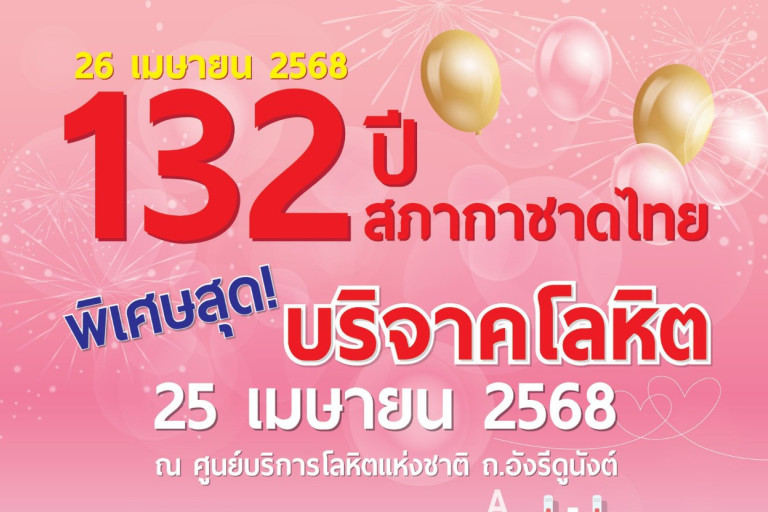 ในโอกาสครบรอบ 132 ปี วันสถาปนาสภากาชาดไทย 26 เมษายน 2568 ศูนย์บริการโลหิตแห่งชาติ จึงขอเชิญชวนคนไทยทั้งประเทศ ร่วมสานต่อพลังแห่งการให้ด้วยการบริจาคโลหิต และร่วมกิจกรรมโพสต์ภาพถ่ายที่แสดงถึงพลังแห่งการให้โลหิต ผ่านโซเชียลมีเดียทุกช่องทาง โดยติดแฮชแท็ก #132ปีแห่งการให้ #รวมพลังเลือดกาชาด เพื่อปลุกกระแสการบริจาคโลหิตช่วยเหลือชีวิตผู้ป่วยพร้อมกันทั่วประเทศ บริจาคโลหิต ได้ที่
