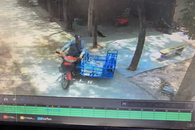 จากการตรวจหลักฐานในภาพวงจรปิดคนร้ายเป็นชายรูปร่างสันทัด ใส่หมวกแก๊ปสีดำใส่แมสใส่เสื้อลายสก็อตขาวดำสะพายกระเป๋าสีดำกางเกงขายาว เดินเข้ามาเหมือนคนคุ้นเคย แล้วเข้าไปหยิบเอากุญแจรถจากช่องเก็บของ ของรถอักคันหนึ่งที่จอดข้างกัน แล้วเอามาเสียบรถจักรยายนต์ ยี่ห้อฮอนด้า เวฟ สีดำ-แดง ไม่ติดแผ่นป้ายทะเบียน ขี่ไปอย่างใจเย็น