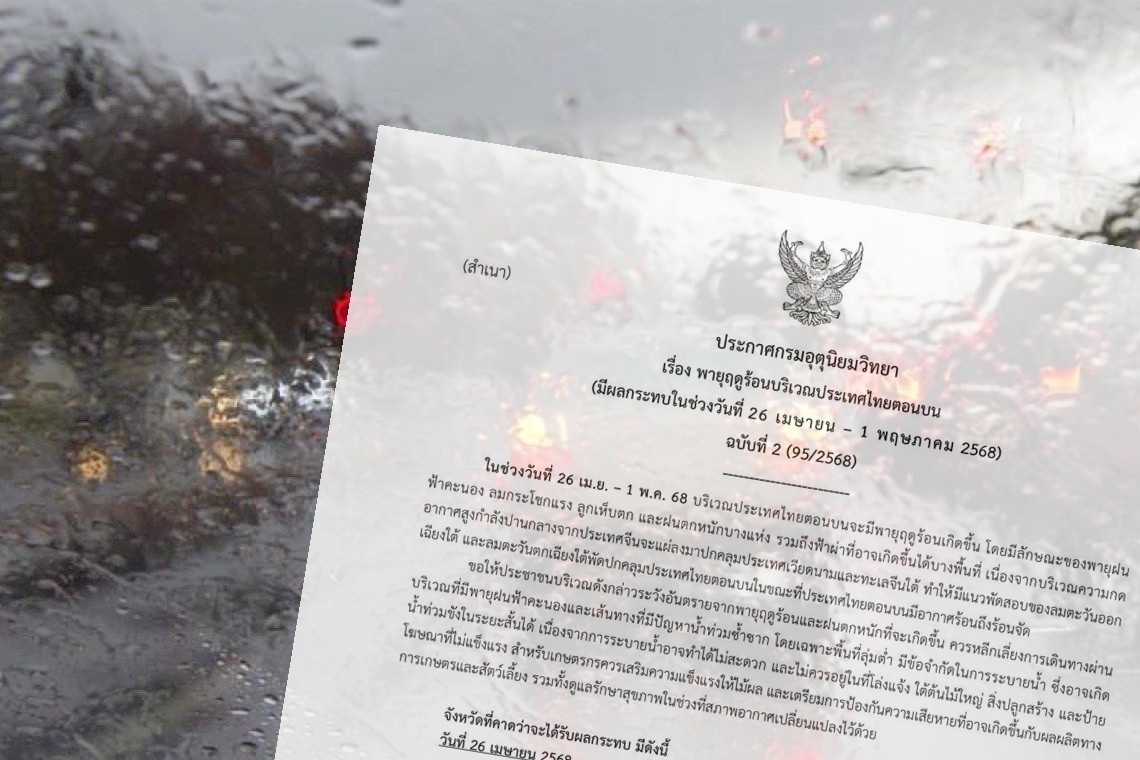 วันที่ 24 เม.ย.68 นางสาวสุกันยาณี ยะวิญชาญ อธิบดีกรมอุตุนิยมวิทยา ออกประกาศกรมอุตุนิยมวิทยา เรื่อง พายุฤดูร้อนบริเวณประเทศไทยตอนบน (มีผลกระทบในช่วงวันที่ 26 เมษายน – 1 พฤษภาคม 2568) ฉบับที่2 (95/2568) ความว่า ในช่วงวันที่ 26 เม.ย. – 1 พ.ค. 68 บริเวณประเทศไทยตอนบนจะมีพายุฤดูร้อนเกิดขึ้น โดยมีลักษณะของพายุฝนฟ้าคะนอง ลมกระโชกแรง ลูกเห็บตก และฝนตกหนักบางแห่ง รวมถึงฟ้าผ่าที่อาจเกิดขึ้นได้บางพื้นที่ เนื่องจากบริเวณความกดอากาศสูงกำลังปานกลางจากประเทศจีนจะแผ่ลงมาปกคลุมประเทศเวียดนามและทะเลจีนใต้ ทำให้มีแนวพัดสอบของลมตะวันออกเฉียงใต้ และลมตะวันตกเฉียงใต้พัดปกคลุมประเทศไทยตอนบนในขณะที่ประเทศไทยตอนบนมีอากาศร้อนถึงร้อนจัด ขอให้ประชาชนบริเวณดังกล่าวระวังอันตรายจากพายุฤดูร้อนและฝนตกหนักที่จะเกิดขึ้น ควรหลีกเลี่ยงการเดินทางผ่านบริเวณที่มีพายุฝนฟ้าคะนองและเส้นทางที่มีปัญหาน้ำท่วมซ้ำซาก โดยเฉพาะพื้นที่ลุ่มต่ำ มีข้อจำกัดในการระบายน้ำ ซึ่งอาจเกิดน้ำท่วมขังในระยะสั้นได้ เนื่องจากการระบายน้ำอาจทำได้ไม่สะดวก และไม่ควรอยู่ในที่โล่งแจ้ง ใต้ต้นไม้ใหญ่ สิ่งปลูกสร้าง และป้ายโฆษณาที่ไม่แข็งแรง สำหรับเกษตรกรควรเสริมความแข็งแรงให้ไม้ผล และเตรียมการป้องกันความเสียหายที่อาจเกิดขึ้นกับผลผลิตทางการเกษตรและสัตว์เลี้ยง รวมทั้งดูแลรักษาสุขภาพในช่วงที่สภาพอากาศเปลี่ยนแปลงไว้ด้วย