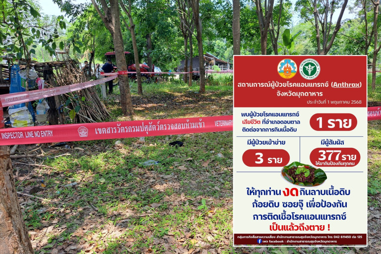 เมื่อวันที่ 1 พฤษภาคม 2568 กลุ่มภารกิจสื่อสารความเสี่ยง สำนักงานสาธารณสุขจังหวัดมุกดาหาร ออกประกาศแจ้งเตือนให้ประชาชนในพื้นที่จังหวัดมุกดาหาร งดบริโภคเนื้อวัว ควาย แพะ และแกะในรูปแบบดิบ เพื่อป้องกันการติดเชื้อโรคแอนแทรกซ์ ซึ่งเป็นโรคติดต่อจากสัตว์สู่คน และอาจก่อให้เกิดอันตรายถึงแก่ชีวิต