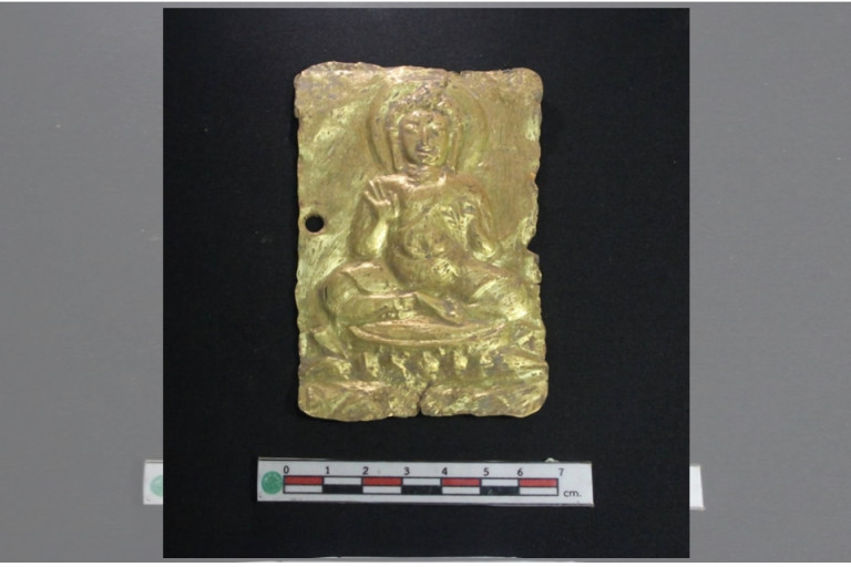 ต่อมาเมื่อวันที่ 30 เมษายนที่ผ่านมา ได้ขุดพบโบราณวัตถุที่ทำด้วยทอง และตะกั่ว ชิน (โลหะผสมที่มีส่วนผสมของตะกั่วและดีบุก) จำแนกออกเป็น 3 รายการ ได้แก่ รายการที่ 1 แผ่นทองดุนรูปพระพุทธรูป ลักษณะรูปทรงสี่เหลี่ยมผืนผ้า สภาพค่อนข้างสมบูรณ์ ขนาดกว้าง 8 เซนติเมตร สูง 12.5 เซนติเมตร ดุนเป็นรูปพระพุทธรูปประทับนั่ง พระเศียรมีประภามณฑลล้อมรอบ เม็ดพระศกขมวดก้นหอยเม็ดใหญ่ พระกรรณยาว พระเนตรเหลือบต่ำ พระโอษฐ์หนา ครองจีวรห่มเฉียง พระกรซ้ายกำชายจีวร พระกรขวาทำวิตรรกมุทรา (ปางแสดงธรรม) นั่งขัดสมาธิราบบนฐานบัว บริเวณกึ่งกลางด้านขวา ของแผ่นทองเจาะรูขนาดเส้นผ่านศูนย์กลาง 0.3 เซนติเมตร สันนิษฐานว่าเจาะไว้สำหรับร้อยสายเพื่อเอาไว้ห้อยหรือผูก