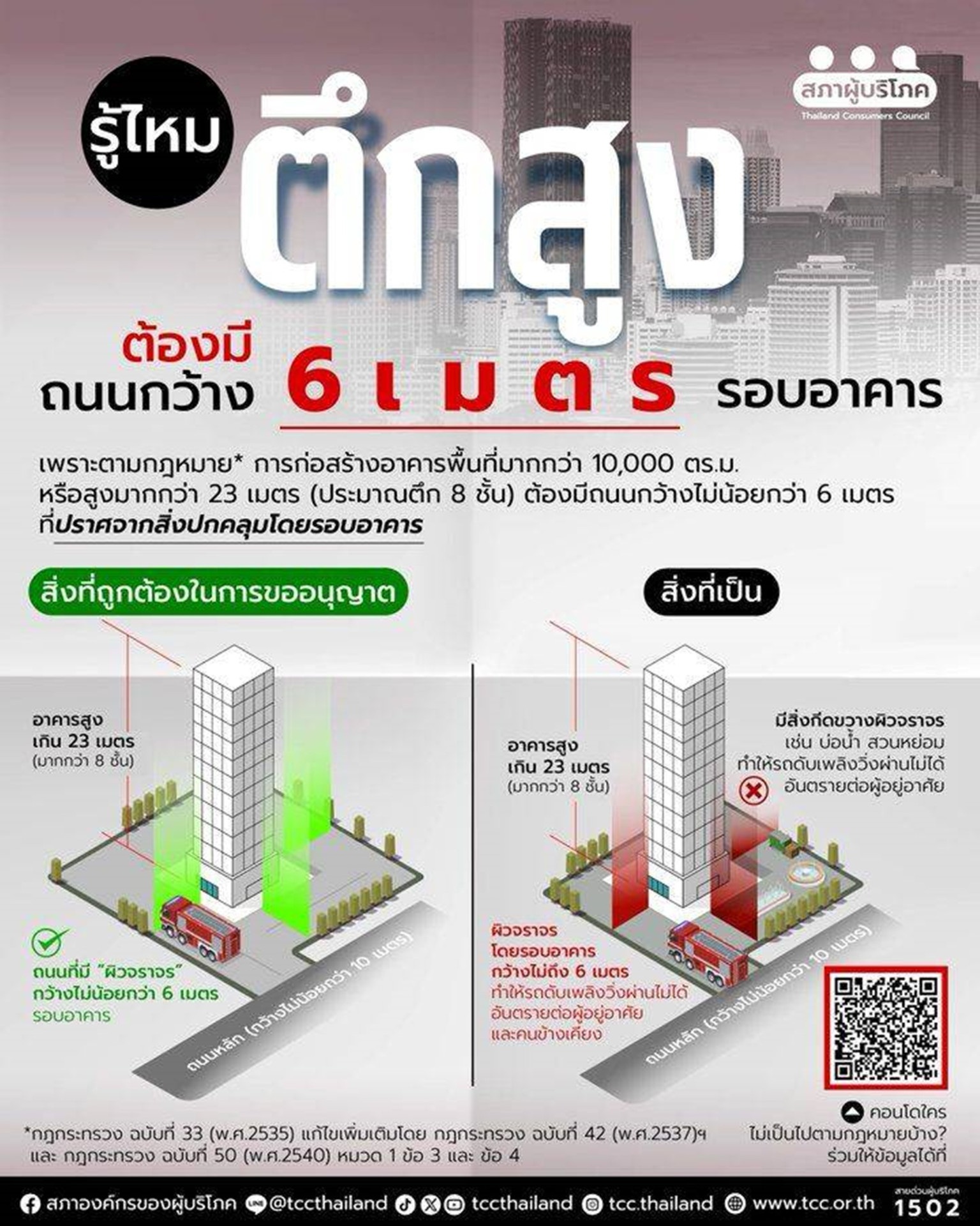 นายอิฐบูรณ์ อ้นวงษา รองเลขาธิการสำนักงานสภาผู้บริโภค กล่าวว่า สภาผู้บริโภคได้รับเรื่องร้องเรียนจากชุมชนในเขตกรุงเทพมหานคร จำนวน 11 ชุมชนเมื่อวันที่ 7 กุมภาพันธ์ 2568 ที่ผ่านมา ว่าได้พบ “อาคารสูงและอาคารขนาดใหญ่พิเศษ” จำนวนหลายแห่งในเขตกรุงเทพมหานคร มีการก่อสร้างอันอาจเข้าข่ายไม่ปฏิบัติตามกฎกระทรวงฉบับที่ 33 (พ.ศ. 2535) ข้อ 3 แห่งพระราชบัญญัติควบคุมอาคาร พ.ศ. 2522 เนื่องจากไม่จัดให้มี “ถนนที่มีผิวการจราจรกว้างไม่น้อยกว่า 6.00 เมตร ที่ปราศจากสิ่งปกคลุมโดยรอบอาคาร เพื่อให้รถดับเพลิงสามารถเข้าออกได้โดยสะดวก” ซึ่งเป็นการกระทำที่เข้าข่ายละเมิดต่อกฎกระทรวงฉบับที่ 33 (พ.ศ. 2535) ข้อ 3 แห่งพระราชบัญญัติควบคุมอาคาร พ.ศ. 2522