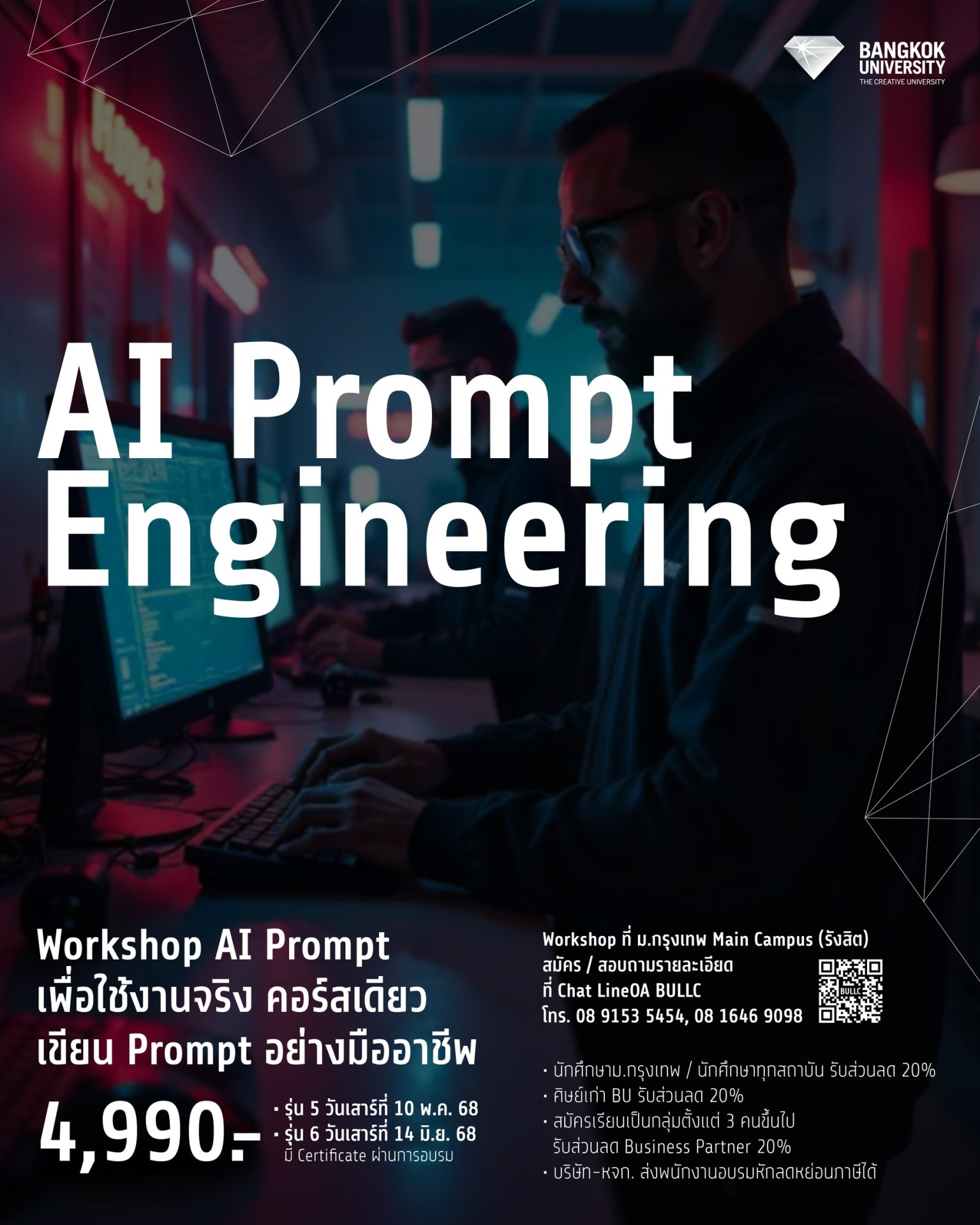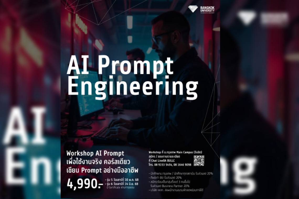ศูนย์การเรียนรู้ตลอดชีวิต มหาวิทยาลัยกรุงเทพ ชวนเรียนเขียน Prompt พร้อมใช้งานได้จริงในหลักสูตร AI Prompt Engineering จะเน้นเรื่อง Text-to-Text, Text-to-VDO, Text-to-Image, Text-to-Music และอีกสารพัดตัวช่วยเพื่อให้คุณนำ AI ไปใช้ได้จริงกับงานบริการ การตลาด งานธุรกิจและงานส่วนตัว โดย อ.เนส ทศพล บ้านคลองสี่ อาจารย์ประจำคณะวิศวกรรมศาสตร์ มหาวิทยาลัยกรุงเทพ (เจ้าของ Youtube: Aj. NesT the Seriesและผู้เขียนหนังสือ Best Seller "เก่งงานและฉลาดหาเงินด้วยเอไอ #ChatGPT x Generative AI") รุ่นที่ 5 วันเสาร์ที่ 10 พ.ค. 68 เวลา 09.00-17.00 น.รุ่นที่ 6 วันเสาร์ที่ 14 มิ.ย. 68 เวลา 09.00-17.00 น.สนใจสมัคร Chat LineOA BULLC > https://lin.ee/smmGcz1 หรือโทร. 089-153-5454, 081-646-9098