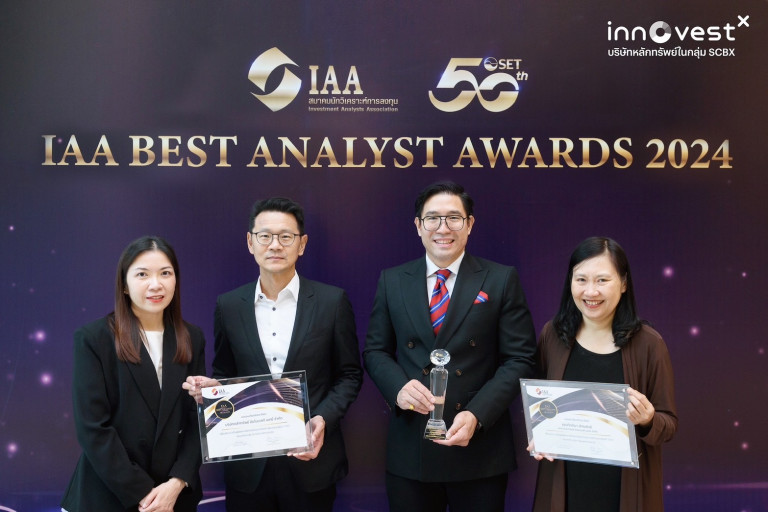 บล.อินโนเวสท์ เอกซ์ เรือธงด้านการลงทุนภายใต้กลุ่มเอสซีบีเอกซ์ (SCBX Group) ประกาศความสำเร็จคว้า 3 รางวัล นักวิเคราะห์ยอดเยี่ยมประจำปี 2024 ได้แก่ 1. นักเศรษฐศาสตร์ตลาดทุนยอดเยี่ยม (Best) 2. ทีมวิเคราะห์การลงทุนยอดเยี่ยม (Outstanding) และ 3. รางวัลกลุ่มธุรกิจการเงินโดดเด่น (Outstanding) จากเวที IAA Best Analyst Awards 2024 ซึ่งจัดโดยสมาคมนักวิเคราะห์การลงทุนร่วมกับตลาดหลักทรัพย์แห่งประเทศไทย สะท้อนถึงศักยภาพของทีมวิจัยและนักวิเคราะห์ของ InnovestX ในการยกระดับมาตรฐานบทวิเคราะห์ของไทยสู่เวทีระดับประเทศ พร้อมขับเคลื่อนวงการลงทุนไทยให้เติบโตอย่างมั่นคงและยั่งยืน โดยมี ดร.ปิยศักดิ์ มานะสันต์ หัวหน้านักวิจัยเศรษฐกิจ พร้อมด้วย นายสุทธิชัย คุ้มวรชัย หัวหน้าฝ่ายกลยุทธ์การลงทุน และนางสาวกิตติมา สัตยพันธ์ นักวิเคราะห์อาวุโสกลุ่มธุรกิจการเงิน บริษัทหลักทรัพย์ อินโนเวสท์ เอกซ์ จำกัด ร่วมรับรางวัล เมื่อเร็วๆ นี้ ณ ตลาดหลักทรัพย์แห่งประเทศไทย