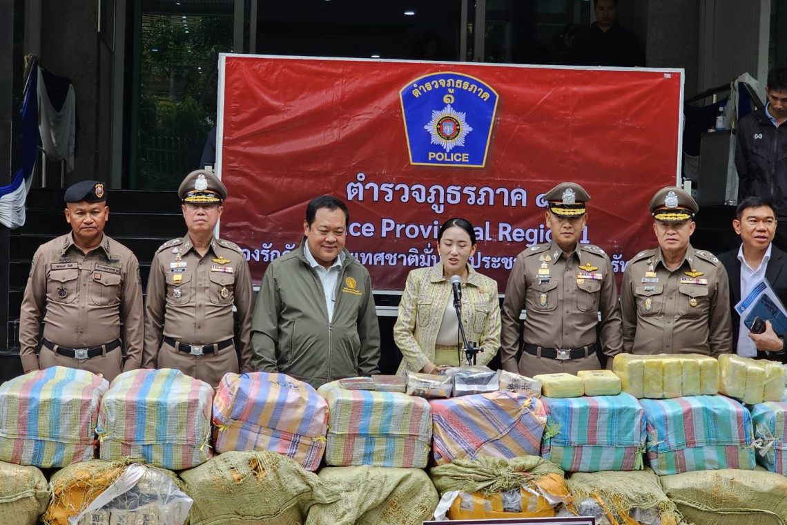 วันที่ 7 พ.ค.68 ที่ บช.ภ.1 น.ส.แพทองธาร ชินวัตร นายกรัฐมนตรี .พ.ต.อ.ทวี สอดส่อง รมว.ยุติธรรมพล.ต.อ.กิตติ์รัฐ พันธุ์เพ็ชร์ ผบ.ตร. พล.ต.อ.ไกรบุญ ทรวดทรง รอง ผบ.ตร./ผอ.ศอ.ปส.ตร. พล.ต.อ.ประจวบ วงศ์สุข รอง ผบ.ตร.พล.ต.ท.ภาณุรัตน์ หลักบุญ เลขาธิการ ปปส.พล.ต.ท.สุรพล เปรมบุตร ผบช.ภ.1 พล.ต.ต.โชคชัย งามวงศ์ รอง ผบช.ภ.1 แถลงข่าวจับกุมผู้ต้องหาพร้อมยาบ้าจำนวน 8 ล้าน 7 แสนเม็ดยาไอซ์ 722 กิโลกรัมเฮโรอีน 0.700 กรัม